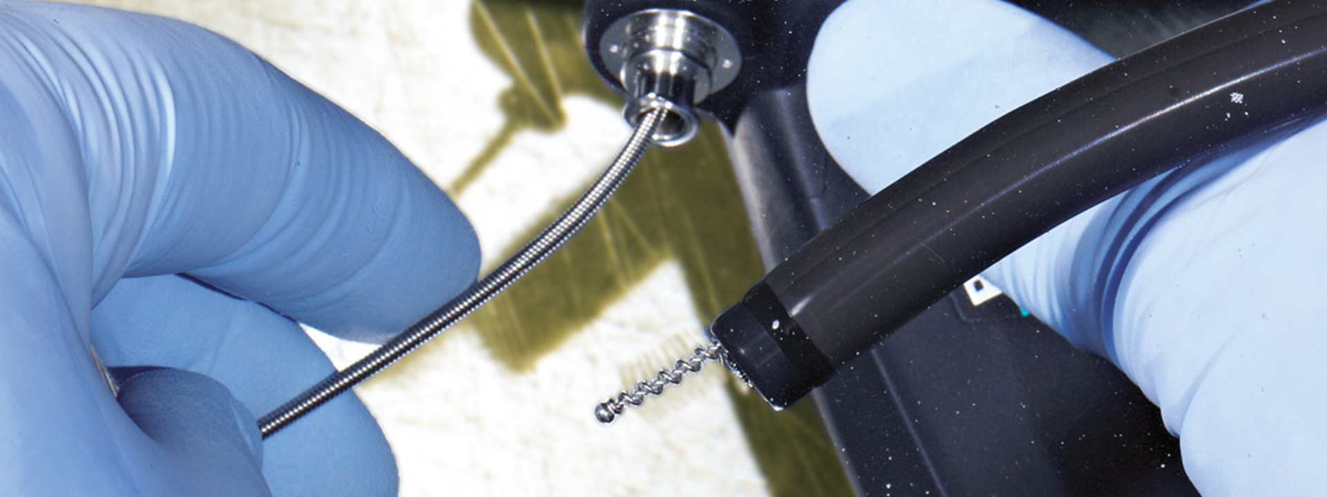 With patented self-acting cleaning system. Gentle removing of persistent contaminations, especially of contrast media residues and biofilm.
