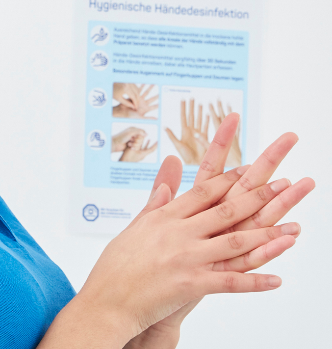 Rub-in method for hand disinfection To ensure successful hand disinfection, all hand areas need to be completely covered with the preparation during rubbing. Learn about the six steps derived from EN 1500 for effective hand disinfection. Learn more